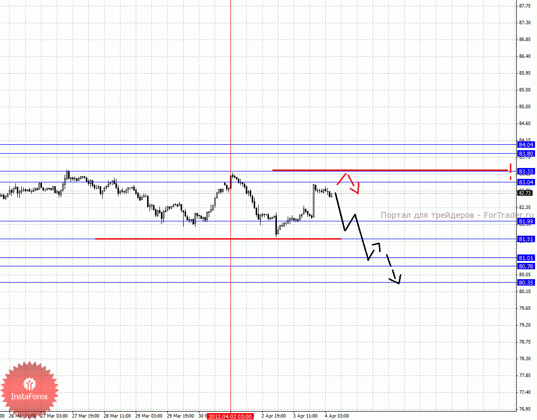 По паре Доллар/Йена ключевыми уровнями являются: 84.04, 83.80, 83.33, 83.04, 81.99, 81.51, 81.01, 80.78 и 80.35. Здесь нисходящая структура от 2 апреля пока остается актуальной для определения целей. Краткосрочное восходящее движение ожидаем в коридоре 83.04 – 83.33, пробой последнего значения должен сопровождаться выраженным восходящим движением, в данном случае цель – 83.80. В коридоре 83.80 – 84.04 консолидация цены. Уровень 81.99 является ключевой поддержкой для верха, его пробой позволит рассчитывать на движение к первой цели – 81.51, далее уровни для нисходящего движения остались без изменения.