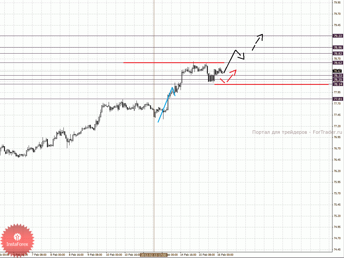 По паре Доллар/Йена ключевыми уровнями являются: 79.22, 78.96, 78.82, 78.62, 78.33, 78.25, 78.14 и 77.81. Здесь ключевые цели остались без изменения, и мы продолжаем следить за локальной восходящей структурой от 13 февраля. Продолжения движения кверху ожидаем после пробоя 78.62, в данном случае цель 78.82, в коридоре 78.82 – 78.96 консолидация цены. Потенциальным значением для верха считаем уровень 79.22, движение к которому ожидаем после пробоя 78.96. Корректировочное нисходящее движение возможно в коридоре 78.33 – 78.25, пробой последнего значения приведет к углубленной коррекции, здесь цель 78.14, от этого уровня высока вероятность разворота к верху, его пробой окажет негативное влияние на последующее формирование восходящей тенденции в масштабе Н1. Уровень 77.81 является ключевой поддержкой для верха и интересен с точки зрения среднесрочной перспективы.