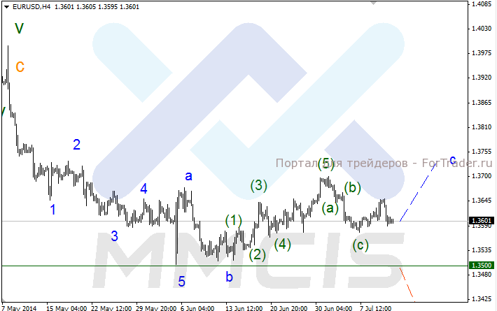 По мнению аналитиков, вчера наблюдался ложный заход вниз, однако подтверждений для продаж не было. Таким образом, в ближайшие несколько недель ожидается завершение восходящего импульса в рамках волны «с».