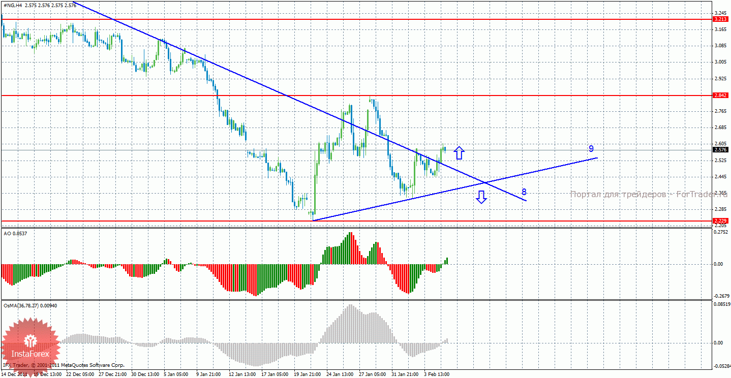 Анализ природного газа за 7 февраля показывает, что цена в понедельник преодолела линию тренда 8, также перестроена линия тренда 9, исходя из этого сейчас возможно восходящее движение. Целью для возможного восходящего движения сейчас выступает уровень сопротивления 2,842, и торговать на повышение с этой целью сейчас можно. Восходящая линия тренда 9 теперь оказывает поддержку быкам и сохраняет перспективы дальнейшего повышения цены на газ после довольно длительного падения. Индикатор Awesome показывает локальное восходящее движение, последний закрытый бар окрашен в зеленый цвет, поэтому рассматривать покупки можно до разворота Awesome обратно вниз. Индикатор OsMA также повышается, сигнализируя о восходящем движении в более долгосрочной перспективе. Локальные коррекции можно определить по разворотам обоих индикаторов вниз.
