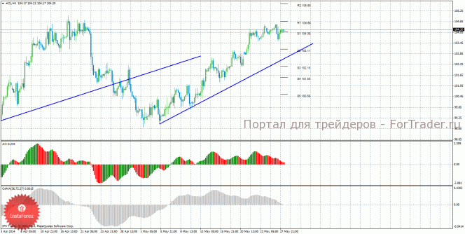Анализ сырой нефти за 28 мая показывает, что цена возобновила восходящее движение, что засвидетельствовало закрепление цены выше уровня 104,08. Восходящее движение может продолжиться с целями R1 – 104,68 и R2 – 105,65, если цена останется выше уровня 104,08. Может начаться нисходящая коррекция с целями уровни 103,11 и 102,15, если цена закрепится ниже уровня 104,08. Сформировалась восходящая линия тренда, которая поддерживает торгующих на повышение и делает актуальным восходящее движение. Индикатор Awesome показывает текущее нисходящее движение, так как последний закрытый бар красного цвета. OsMA также направлен вниз, что говорит о нисходящем характере движения и в более долгосрочном плане. Оба индикатора сейчас с высокой долей вероятность разряжаются. Отскок цены от уровня 104,68 может спровоцировать новый виток коррекционного движения.