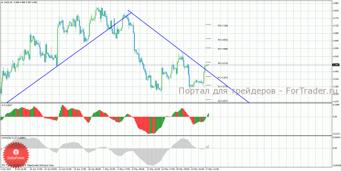 Анализ природного газа за 28 мая показывает, что цена закрепилась выше нисходящей линии тренда, поэтому тенденция на рынке поменялась на восходящую. На данный момент актуально восходящее движение с целями уровни сопротивления R2 – 4,5130 и R3 – 4,5990. Целью для нисходящей коррекции выступают уровни 4,4270 и 4,3730, если цена отскочит от уровня 4,5130. Цена закрепилась выше нисходящей линии тренда, поэтому нисходящее движение сейчас не актуальны и можно рассматривать ордера на покупку. Индикатор Awesome показывает локальное восходящее движение, последний закрытый бар окрашен в зеленый цвет. OsMA также направлен вверх, что сигнализирует о восходящем движении цены на газ и в более долгосрочной перспективе. Отскок цены от уровня 4,5130 может спровоцировать виток коррекционного движения.