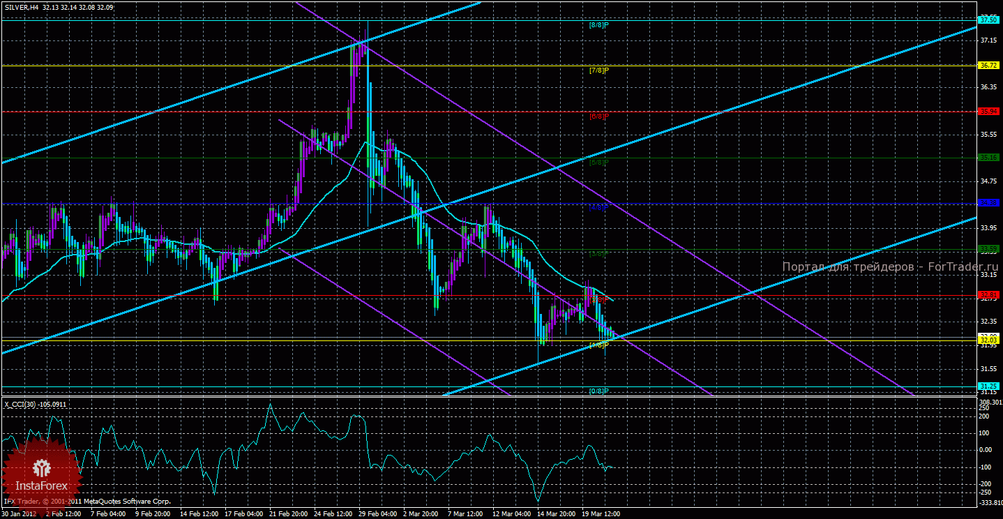 Исходя из анализа серебра 21 марта, видно, что курс продолжает сохранять перспективы дальнейшего снижения, курс скорректировался к мувингу, но выше него подняться не сумел. Старший канал направлен вверх, что свидетельствует о восходящем направлении движения глобального тренда. Младший канал направлен вниз, что означает нисходящее движение в менее долгосрочном плане. Сейчас цена находится ниже мувинга и ниже уровня Мюррея «2/8», что делает более вероятным нисходящее движение. Первой целью нисходящего движения является уровень Мюррея «1/8» — 32,03, который уже достигнут медведями, но пока не преодолен. В случае преодоления первого целевого уровня, нисходящее движение может продолжиться с целью «0/8» — 31,25. Скользящая средняя направлена вниз, а цена в свою очередь находится ниже нее, что сигнализирует о текущем нисходящем направлении движения. Длинные позиции будут актуальны только после закрепления курса выше мувинга. Хайкен Аши окрасил последние бары в голубой цвет, что сигнализирует о локальном нисходящем движении и позволяет открывать и поддерживать сейчас шорты с обозначенными выше целями. Индикатор CCI находится около уровня -100, что свидетельствует о небольшой перепроданности курса серебра.