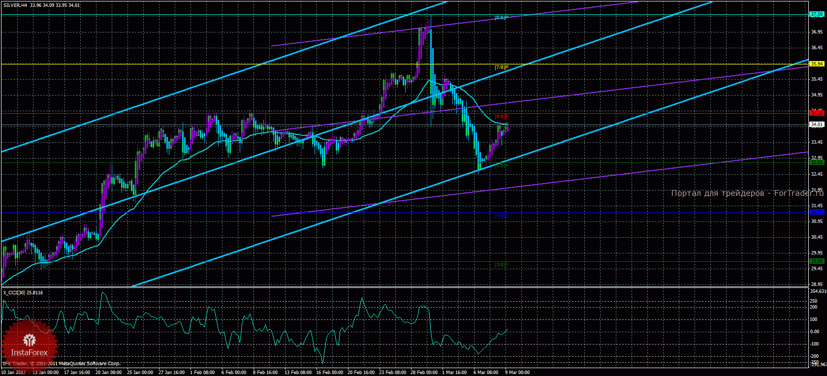 Исходя из анализа серебра 9 марта, видно, что курс продолжает нисходящее движение, однако заходить в рынок с короткими позициями по-прежнему не рекомендуется, так как большинство индикаторов направлено вверх. Старший канал направлен вверх, что свидетельствует о восходящем направлении движения глобального тренда. Младший канал направлен вверх, что означает восходящее движение в менее долгосрочном плане. Сейчас цена находится ниже мувинга и ниже уровня Мюррея «6/8», что делает более вероятным нисходящее движение. Первой целью нисходящего движения является уровень Мюррея «5/8» — 32,81, но начинать торговлю на понижение не рекомендуется, так как оба канала направлены наверх. В случае преодоления первого целевого уровня, нисходящее движение может продолжиться с целью «4/8» — 31,25. Скользящая средняя направлена вбок, а цена в свою очередь находится ниже нее, что сигнализирует о текущем нисходящем направлении движения. Короткие позиции можно будет рассматривать только после разворота одного из каналов вниз. Длинные позиции будут актуальны после закрепления курса выше мувинга. Хайкен Аши окрасил последние бары в фиолетовый цвет, что сигнализирует о локальном восходящем движении, однако, заходить в рынок сейчас в любом случае преждевременно. Индикатор CCI находится около нулевого уровня, что свидетельствует об отсутствии какой-либо перекупленности или перепроданности курса серебра.