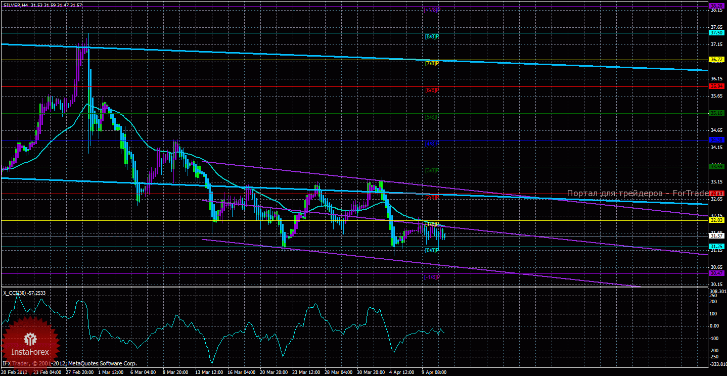 Исходя из анализа серебра 11 апреля, видно, что курс также продолжает коррекцию вверх и почти достиг мувинг, вслед за золотом курс серебра также может в ближайшее время его преодолеть. Старший канал развернулся вбок, что свидетельствует о боковом направлении движения глобального тренда и его поступательном развороте вниз. Младший канал направлен вниз, что означает нисходящее движение в менее долгосрочном плане. Сейчас цена находится ниже мувинга и ниже уровня Мюррея «1/8», что делает более вероятным продолжение нисходящего движения. Первой целью нисходящего движения является уровень Мюррея «0/8» — 31,25, который уже достигнут медведями. В случае преодоления первого целевого уровня, нисходящее движение может продолжиться с целью «-1/8» — 30,47. Скользящая средняя направлена вниз, а цена в свою очередь находится ниже нее, что сигнализирует о текущем нисходящем направлении движения. Длинные позиции будут вновь актуальны только после закрепления курса выше мувинга и разворота одного из каналов регрессии наверх. Хайкен Аши окрасил последние бары в голубой цвет, что сигнализирует о локальном нисходящем движении, поэтому сейчас можно открывать и поддерживать короткие позиции до разворота этого индикатора наверх. Индикатор CCI находится около уровня -100, что свидетельствует о слабой перепроданности инструмента.