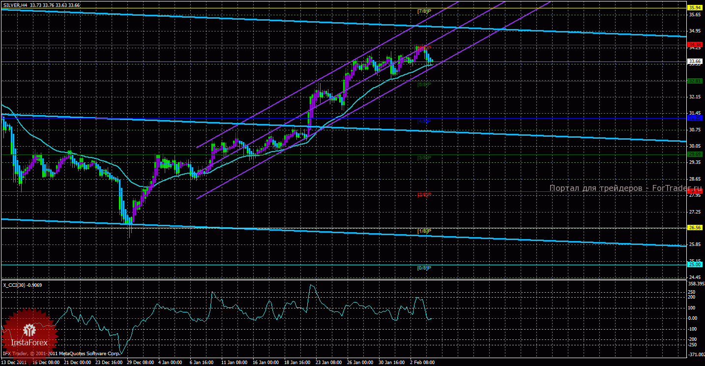 Исходя из анализа серебра 6 февраля видно, что курс продолжает находиться в восходящем тренде, о чем красноречиво говорит младший канал линейной регрессии, ниже мувинга курс опустится не может, что говорит о слабости намерений медведей. Старший канал направлен вниз, что свидетельствует о нисходящем направлении движения глобального тренда. Младший канал направлен вверх, что означает восходящее движение в менее долгосрочном плане. Сейчас цена находится выше мувинга и выше уровня Мюррея «5/8», что делает актуальным восходящее движение. Первой целью восходящего движения является уровень Мюррея «6/8» — 34,38 и торговать на повышение с этой целью можно. В случае преодоления первого целевого уровня, восходящее движение продолжиться с целью «7/8» — 35,94. Скользящая средняя направлена вверх, а цена в свою очередь находится выше нее, что сигнализирует о текущем восходящем движении. Короткие позиции можно будет рассматривать только после закрепления цены ниже мувинга с целью 31,25. Хайкен Аши окрасил последние бары в голубой цвет, что сигнализирует о локальном нисходящем движении, поэтому ордера на покупку можно будет открывать после разворота этого индикатора наверх. Индикатор CCI находится около уровня 0, что не свидетельствует о перекупленности или перепроданности курса серебра, прошлая же перекупленность привела к текущей коррекции.