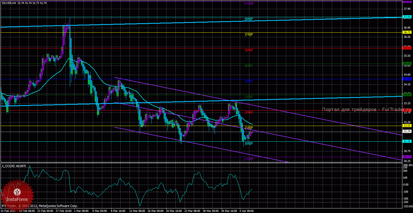 Исходя из анализа серебра 6 апреля, видно, что курс очень сильно сейчас коррелирует с золотом, закрепился ниже скользящей средней и на данный момент начал коррекцию вверх. Старший канал направлен вверх, что свидетельствует о восходящем направлении движения глобального тренда. Младший канал направлен вниз, что означает нисходящее движение в менее долгосрочном плане. Сейчас цена находится ниже мувинга и ниже уровня Мюррея «1/8», что делает более вероятным продолжение нисходящего движения. Первой целью нисходящего движения является уровень Мюррея «0/8» — 31,25, который уже достигнут медведями. В случае преодоления первого целевого уровня, нисходящее движение может продолжиться с целью «-1/8» — 30,47. Скользящая средняя направлена вниз, а цена в свою очередь находится ниже нее, что сигнализирует о текущем нисходящем направлении движения. Длинные позиции будут вновь актуальны только после закрепления курса выше мувинга, не ранее. Хайкен Аши окрасил последние бары в фиолетовый цвет, что сигнализирует о локальном восходящем движении, поэтому сейчас рекомендуется дождаться возобновления нисходящего движения. Индикатор CCI находится около уровня -100, что свидетельствует о слабой перепроданности инструмента.