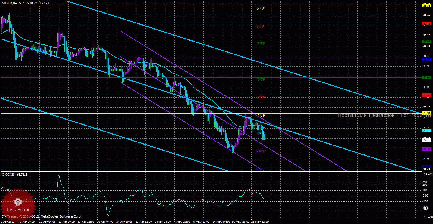 Исходя из анализа серебра 23 мая, видно, что цена завершила коррекцию, вновь закрепилась ниже скользящей средней, поэтому в ближайшие дни может опуститься к уровню 26,56. Старший канал направлен вниз, что свидетельствует о нисходящем направлении движения глобального тренда. Младший канал направлен вниз, что означает нисходящее движение и в менее долгосрочном плане. Сейчас цена находится ниже мувинга и ниже уровня Мюррея «0/8», что делает более вероятным продолжение нисходящего движения. Первой целью нисходящего движения является уровень Мюррея «-1/8» — 27,34, этот уровень уже был отработан ценой. Если курс серебра сумеет закрепиться ниже этого уровня, то продажи можно будет продолжать с целью «-2/8» — 26,56. По достижении и преодолении этого уровня все уровни Мюррея перерисуются и будут образованы новые уровни. Скользящая средняя направлена вбок, а цена в свою очередь находится ниже нее, что сигнализирует о текущем нисходящем направлении движения. Длинные позиции будут вновь актуальны только после закрепления курса выше мувинга и разворота одного из каналов регрессии наверх. Хайкен Аши окрасил последние бары в голубой цвет, что сигнализирует о локальном нисходящем движении, поэтому сейчас можно рассматривать ордера на продажу до тех пор, пока Хайкен Аши направлен вниз. Индикатор CCI находится около уровня -100, что свидетельствует о слабой перепроданности инструмента.