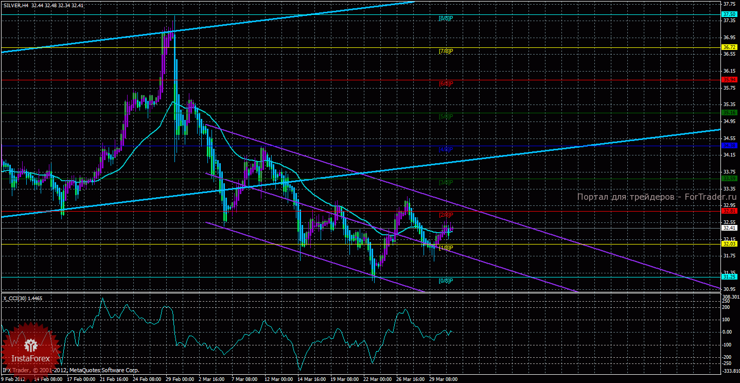 Исходя из анализа серебра 2 апреля, видно, что курс закрепился выше скользящей средней, поэтому сейчас актуальны длинные позиции по этому инструменту, так как старший канал направлен наверх. Старший канал направлен вверх, что свидетельствует о восходящем направлении движения глобального тренда. Младший канал направлен вниз, что означает нисходящее движение в менее долгосрочном плане. Сейчас цена находится выше мувинга и выше уровня Мюррея «1/8», что делает более вероятным восходящее движение. Первой целью восходящего движения является уровень Мюррея «2/8» — 32,81. В случае преодоления первого целевого уровня, восходящее движение может продолжиться с целью «3/8» — 33,59. Скользящая средняя направлена вбок, а цена в свою очередь находится выше нее, что сигнализирует о текущем восходящем направлении движения. Хайкен Аши окрасил последние бары в фиолетовый цвет, что сигнализирует о локальном восходящем движении, поэтому сейчас можно открывать длинные позиции с обозначенными выше целями до разворота этого индикатора вниз, что может означать начало коррекции. Индикатор CCI находится около нулевого уровня, что свидетельствует об отсутствии перекупленности или перепроданности инструмента.