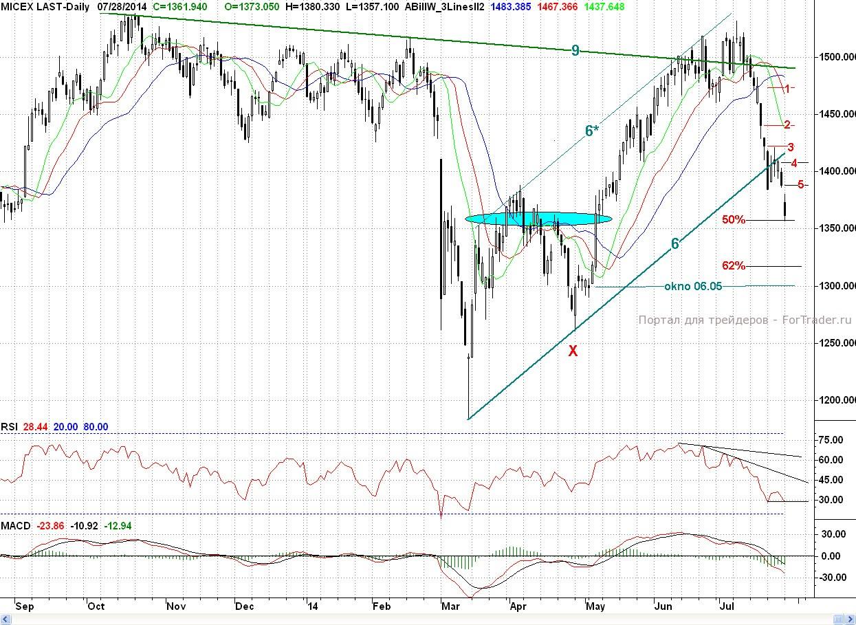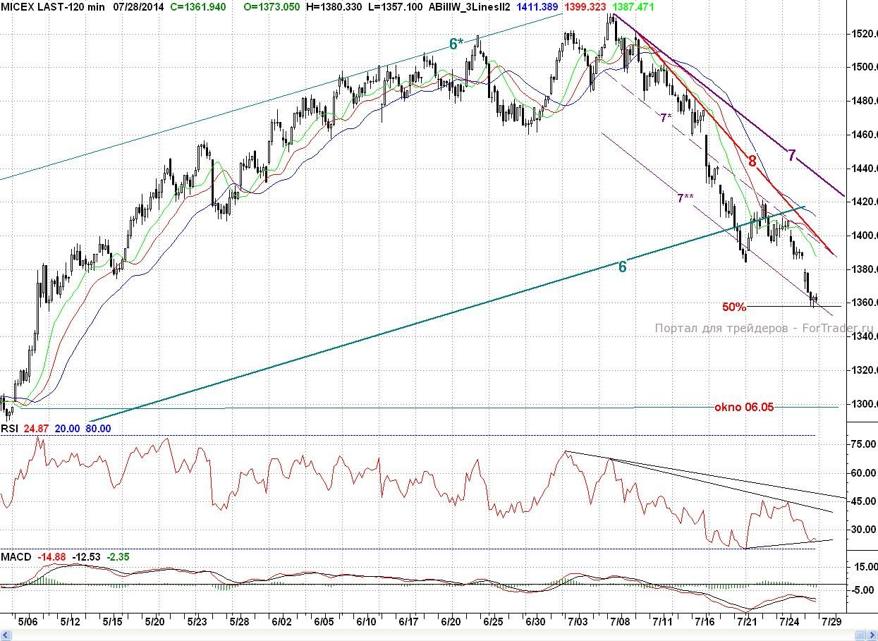 Исследуя 2-часовой график индекса ММВБ, видим, что открывшись с большим гэпом вниз, дальнейшего падения сразу не произошло. Более того, котировки попытались подрасти. Однако покупатели не многого добились (утренний разрыв так и не был ликвидирован), а после полудня продавцы снова взяли бразды правления в свои руки, и цены уверенно пошли вниз. Поддержку они встретили только на основном рубеже бычьей обороны в лице уровня 50% коррекции (~1 360 п.) от весенне — летнего роста. От данного района котировки немного подросли. Тем не менее, день завершился в сильном минусе (1,91%), а индекс РТС за счет ослабления рубля упал на 3,00%.