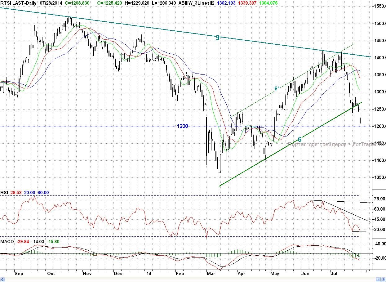 По индексу РТС котировки достигли района 1200 п. А это своеобразная «ватерлиния» Российского фондового рынка. Так что от этих уровней наиболее вероятен отскок. И по его силе можно будет судить о дальнейших бычьих перспективах. На сегодня ближайшим сопротивлением выступит вчерашний максимум (~1 380 п.), а далее незакрытое окно №5 (~1 388 п.) того же дня. Кстати быки за две недели бегства оставили аж 5 окон, и только одно из них(№3) было закрыто. Но остается большим вопросом — настало ли время закрывать эти окна?