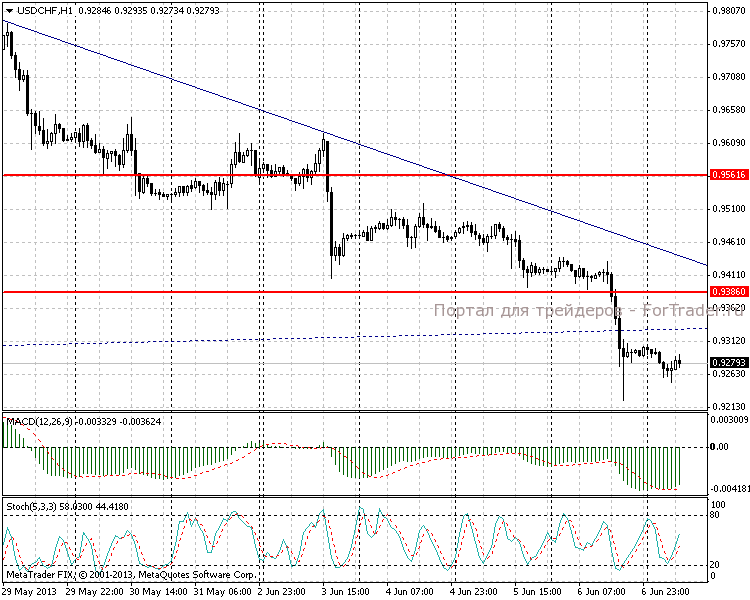 Председатель ЕЦБ заявил, что экономика еврозоны постепенно стабилизируется и больше не нуждается в денежно-кредитном стимулировании. Речь Драги вызвала повсеместное падение доллара США, вследствие чего валютная пара пробила линию тренда и ключевую поддержку 0,9385, и устремилась ниже. Сдержать активность продавцов удалось при подходе к 0,9200. MACD ускорил падение и перешел в отрицательную область, дневной стохастик опустился ниже отметки 20, сигнализируя о состоянии перепроданности.