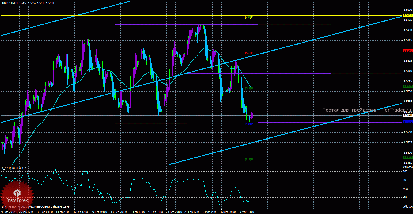 Курс фунта 13 марта тоже находится ниже скользящей средней, подтвердив тем самым ложность пятничного закрепления выше мувинга, таким образом, нисходящее движение продолжается. Старший канал направлен вверх, что свидетельствует о развороте глобального тренда наверх. Младший канал развернулся вбок, что означает боковое направление движения в менее долгосрочном плане и возможный разворот канала вниз. Цена находится ниже уровня Мюррея «5/8», а также ниже скользящей средней. Поэтому текущей целью нисходящего движения является уровень Мюррея «4/8» — 1,5625, но торговать на понижение с этой целью пока не рекомендуется. В случае преодоления уровня Мюррея «4/8», следующим целевым уровнем будет «3/8» — 1,5503. Обращая внимание на индикатор Хайкен Аши, который окрасил последние бары в фиолетовый цвет, можно сказать о локальном восходящем движении, однако, в любом случае ордера на продажу сейчас открывать не рекомендуется. Скользящая средняя направлена вниз, а цена в свою очередь находится ниже нее, поэтому сейчас более актуально нисходящее движение. Шорты будут вновь актуальны после разворота одного из каналов линейной регрессии вниз. А вот лонги можно будет открывать не ранее закрепления цены выше мувинга. Индикатор CCI находится около уровня -100, что свидетельствует о небольшой перепроданности валютной пары.