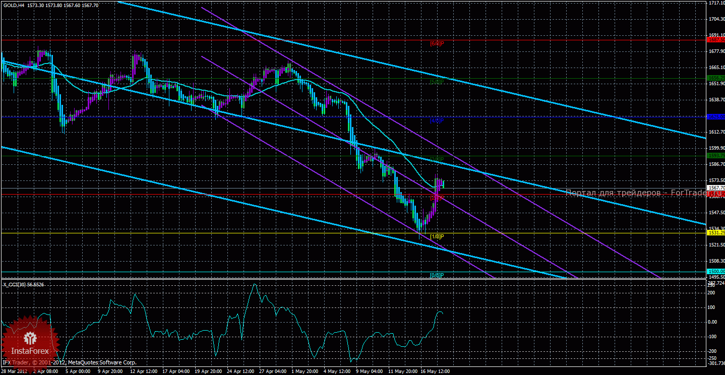 Исходя из картины, сложившейся по золоту 18 мая, видно, что инструмент, достигнув уровня Мюррея «1/8», решил скорректироваться и повысился к скользящей средней, однако, не преодолел ее. Старший канал направлен вниз, что свидетельствует о нисходящем направлении движения глобального тренда. Младший канал также направлен вниз, что означает нисходящее направление движения и в среднесрочном плане. На данный момент цена находится ниже мувинга и ниже уровня Мюррея «3/8», что говорит нам о нисходящем направлении движения в ближайшей перспективе. Все уровни Мюррея в ходе вчерашних торгов перерасчитались. Первой целью нисходящего движения, таким образом, является уровень Мюррея «1/8» — 1531,25, для этого нужно закрепление ниже уровня «2/8». В случае преодоления этого уровня Мюррея, следующим таргетом для снижения курса будет выступать уровень Мюррея «0/8» — 1500,00. Скользящая средняя направлена вбок, а цена находится ниже нее, поэтому сейчас более вероятно нисходящее движение в ближайшие дни. Хайкен Аши окрасил несколько баров в фиолетовый цвет, что сигнализирует о текущем восходящем движении, поэтому сейчас рекомендуется дождаться завершения коррекции и разворота этого индикатора вниз для возобновления торговли на понижение. Длинные позиции станут актуальными после закрепления цены выше мувинга и разворота одного из каналов наверх. Индикатор CCI находится около уровня -100, что говорит о не сильной перепроданности инструмента.