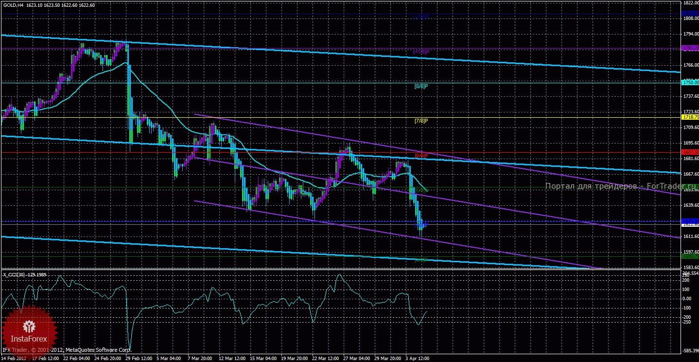 Исходя из картины, сложившейся по золоту 5 апреля, видно, что инструмент в среду продолжил движение предыдущего дня, старший канал также развернулся вниз, поэтому сейчас актуальны только шорты. Старший канал развернулся вниз, что свидетельствует о нисходящем направлении движения глобального тренда. Младший канал направлен вниз, что означает нисходящее направление движения в среднесрочном плане. На данный момент цена находится ниже мувинга и ниже уровня Мюррея «4/8», что говорит нам о нисходящем направлении движения. Первой целью нисходящего движения, таким образом, является уровень Мюррея «3/8» — 1593,75. В случае преодоления ценой этого уровня, следующей целью будет выступать уровень «2/8» — 1562,50. Скользящая средняя направлена вниз, а цена находится ниже нее, поэтому сейчас более вероятно продолжение нисходящего движения. Хайкен Аши окрасил несколько баров в голубой цвет, что сигнализирует о локальном нисходящем движении, поэтому сейчас открывать и поддерживать шорты можно, при формировании 1-2 баров фиолетового цвета это будет означать начало восходящей коррекции. Ордера на покупку можно будет вновь рассматривать только после закрепления цены выше мувинга первой целью 1687,50. Индикатор CCI находится около уровня -100, что говорит о наличие небольшой перепроданности инструмента.