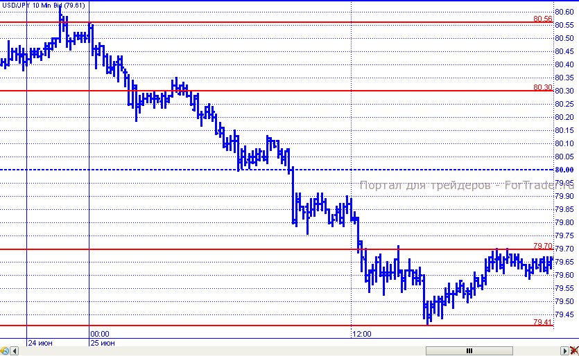 Бегство от рисков привело к тому, что иена смогла отыграть у доллара понесенные ранее потери. От уровня 80,56 доллар/иена устремилась вниз. В рамках нисходящего движения цены преодолели поддержку 80,30, 80,00 и 79,70. Сдержано падение было уровнем 79,40, от которого к завершению торговых суток цены совершили возвратный ход к отметке 79,70.