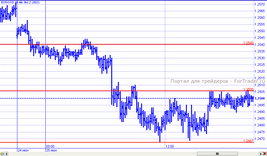 C самого начала торговых суток в понедельник евро нес потери. Попытка вернуться выше уровня 1,2540 ничем хорошим не увенчалась и пара в рамках нисходящего движения преодолела поддержку 1,2500 и продолжила движение вниз к следующему барьеру на 1,2460, до которого не добралась всего несколько пунктов (минимум дня на 1,2467). Остаток дня цены провели в пределах диапазона 1,2467 – 1,2506, завершив сутки в районе его верхней границы.