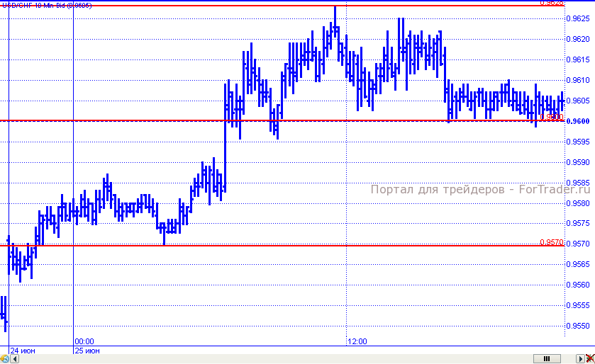 Потери по отношению к доллару в понедельник понес и швейцарский франк. Цены после краткосрочной консолидации чуть выше уровня 0,9570, устремились вверх и в рамках восходящего движения преодолели сопротивление 0,9600. Но на этом не остановились и продолжили подъем к уровню 0,9628. Но к завершению торговых суток все же вернулись в район, теперь уже поддержки, 0,9600.