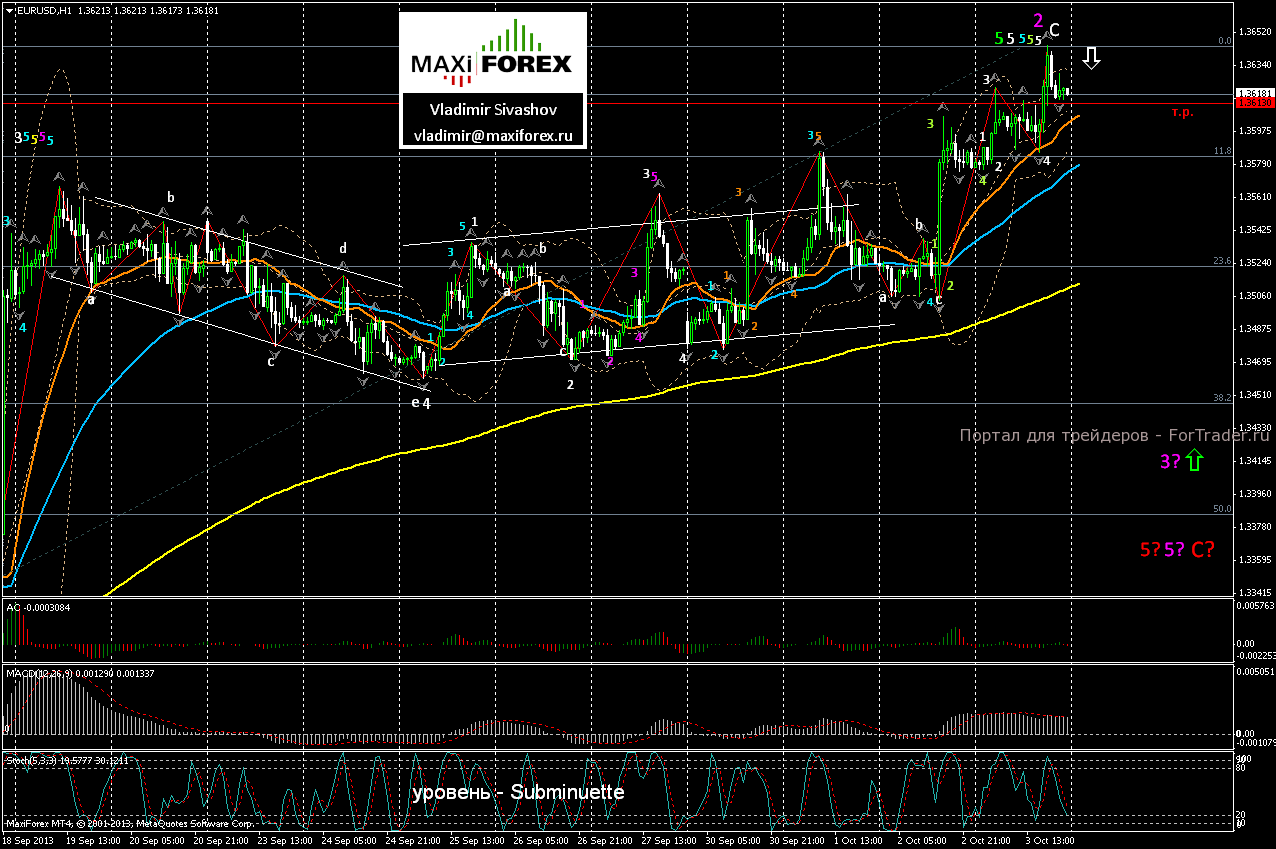 В нашем прогнозе на пятницу предполагаем завершение подъёма курса единой европейской валюты в районе ценового уровня 1.3668, а затем — разворот и возобновление нисходящего движения пары к целевым уровням: 1.3613; 1.3590; 1.3545 и 1.35.