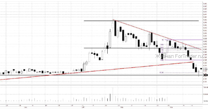 Рассмотрим акции ФСК ЕЭС с позиции технического анализа. С февраля месяца акции стремительно потеряли в весе — только за последние 6 торговых сессий — около 10%. Снизившись в район мощной поддержки на 0,357 р. вчера акции оформили модель однодневный разворот — установив новый локальный минимум закрылись на положительной территории, что говорит о смене настроений. Также, в районе вышеуказанной поддержки на 0,357 р. проходит уровень коррекции 161,8% по Фибоначчи. В случае технического отскока котировки достигнут район открытого гепа на 0,382 р. от 15 марта, где также проходит линия пробитого восходящего тренда.