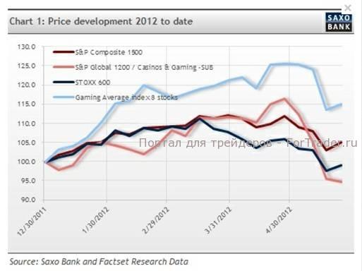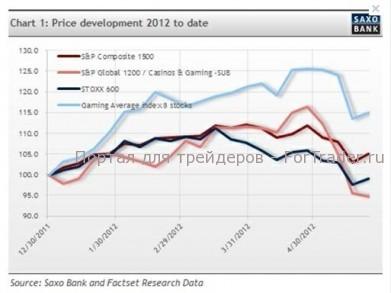 На графике 2 показаны акции S&P1500 Global — в 2012 году они выросли примерно на 5%, — а также акции European Stoxx 600, — они не сдвинулись с мертвой точки, оставшись на уровне Index 100. Мировой индекс казино и игровой индустрии потерял 5%. Разработанный мной простой усредненный индекс восьми букмекерских компаний проявил себя лучше остальных, увеличившись на 15%. И я этому не удивлен, что он опередил мировой подиндекс S&P по казино и игровой индустрии, поскольку он включает акции казино, существующих физически, например, в Лас-Вегасе и Макао. Они в гораздо большей степени подвержены влиянию циклических факторов, поскольку их услуги являются частью общей структуры организации досуга. Вы приезжаете (платите за дорогу), снимаете номер в гостинице (опять-таки, платите за него), обедаете в ресторане (платите), и только потом идете играть. Однако в сложной экономической ситуации можно играть онлайн, избегая расходов, связанных с путешествием. Онлайн казино и букмекеры менее волатильны, а люди склонны к азартным играм, даже когда экономика идет под откос. Казино Лас-Вегаса и Макао живут по законам цикла, но это уже совсем другая история.