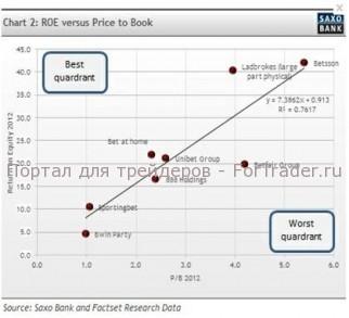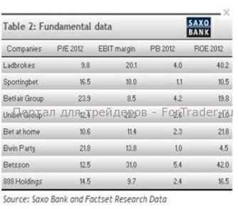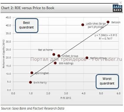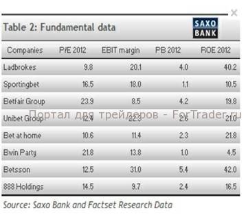 Я не поклонник Betfair (BET.L), поскольку акционер получает низкий доход по сравнению с уплаченной стоимостью, то есть, акция переоценена. Bwin тоже меня не привлекает своей доходностью. Акции Ladbrokes кажутся относительно дешевыми. Bet-at-home тоже стоят дешево, а Unibet (UNIB SDB), Sportingbet (SBT.L) и 888 (888.L) имеют справедливую оценку. То же самое можно сказать и о Betsson(BETS-B.ST), но, учитывая высокий коэффициент Р/В, я бы предпочел начать с других акций. Любая неприятность обойдется вам очень дорого, стоит ли рисковать?