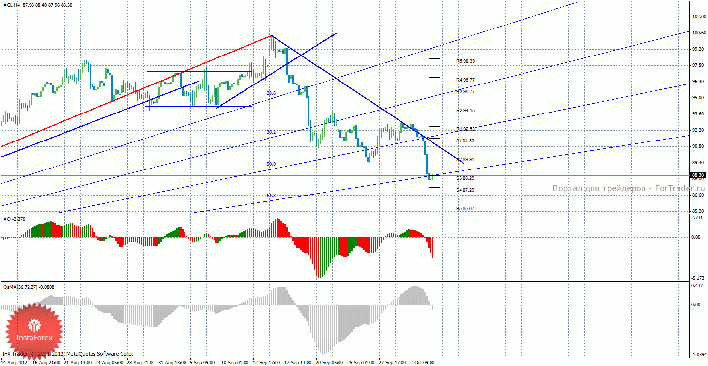 Анализ сырой нефти за 4 октября показывает, что цена все-таки отскочила от линии тренда и продолжила нисходящее движение, оба индикатора развернулись вниз, сигнализируя о нисходящем движении. Новая нисходящая линия тренда поддерживает торгующих на понижение, выше нее можно размещать стоп-лосс, а закрепление выше нее цены будет означать смену тенденции. Нисходящее движение может продолжиться с целями 87,29 и 85,67. Если же цена закрепиться выше уровня S3 – 88,26, то может начаться восходящее движение с целью линия тренда. Индикатор Awesome показывает текущее нисходящее движение, так как последний закрытый бар красного цвета. OsMA также направлен вниз, что говорит о нисходящем характере движения и в более долгосрочном плане.