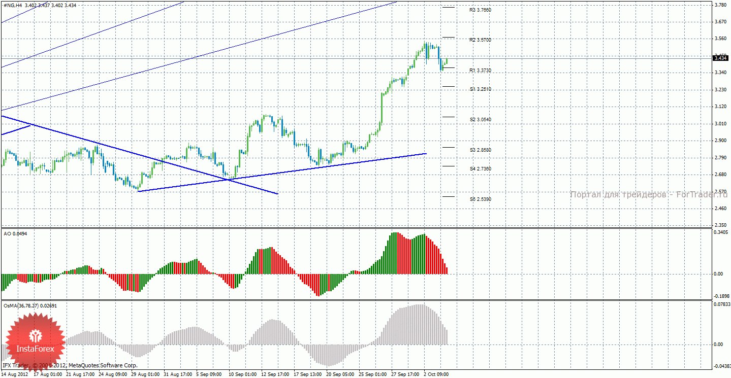 Анализ природного газа за 4 октября показывает, что цена продолжает сильное восходящее движение и скорректировалась к уровню поддержки 3,3730, от которого может отскочить. Целями для продолжения восходящего движения сейчас выступают 3,5700 и 3,7660, но для этого требуется отскок цены от уровня 3,3730. Закрепление цены ниже уровня R1 – 3,3730 укажет на возможное начало коррекции с целями 3,2510 и 3,0540. Новая восходящая линия тренда поддерживает торгующих на повышение, но у нее достаточно малый угол наклона, хотя слабой ее назвать нельзя. Индикатор Awesome показывает локальное нисходящее движение, последний закрытый бар окрашен в красный цвет. OsMA также развернулся вниз, что сигнализирует о нисходящем движении цены на газ и в более долгосрочной перспективе.