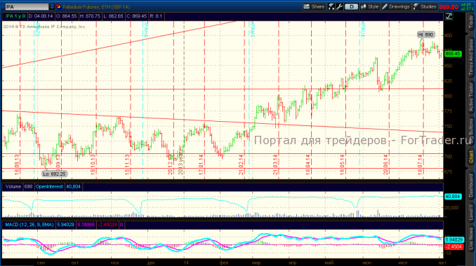 Рынок палладия снижался до уровня 860$, показывая слабость под давлением негативной динамики рынков прочих драгоценных металлов, но вновь подрос до уровня 869$ в результате увеличения инвестиционного спроса. Поддержку ценам обеспечивают санкции для России со стороны Запада и рост спроса на металл в Китае и США.