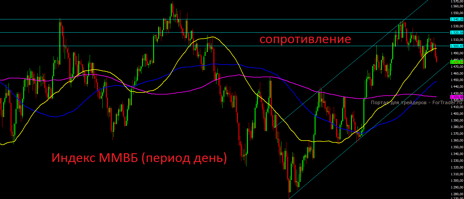 На текущий момент российский индекс ММВБ пока ещё находится в восходящем тренде, но почти вплотную подошёл к его нижней границе, которая находится на отметке 1465 пунктов. Если мы увидим движение индекса вниз ещё на 1.5%-2% то весь этот восходящий тренд, который начал был сформирован ещё в мае, будет пробит, и нам откроются новые серьёзные цели для снижения. Мы уже не первый день и не первую неделю рекомендуем своим клиентам закрывать все длинные позиции на любых всплесках оптимизма и стараться зарабатывать на продажах, открывая короткие позиции. На фондовом рынке, нужно уметь зарабатывать не только на росте, но и на снижении, ибо не всегда бывают хорошие и длинные циклы роста, а падает рынок всегда стремительней, чем растёт.