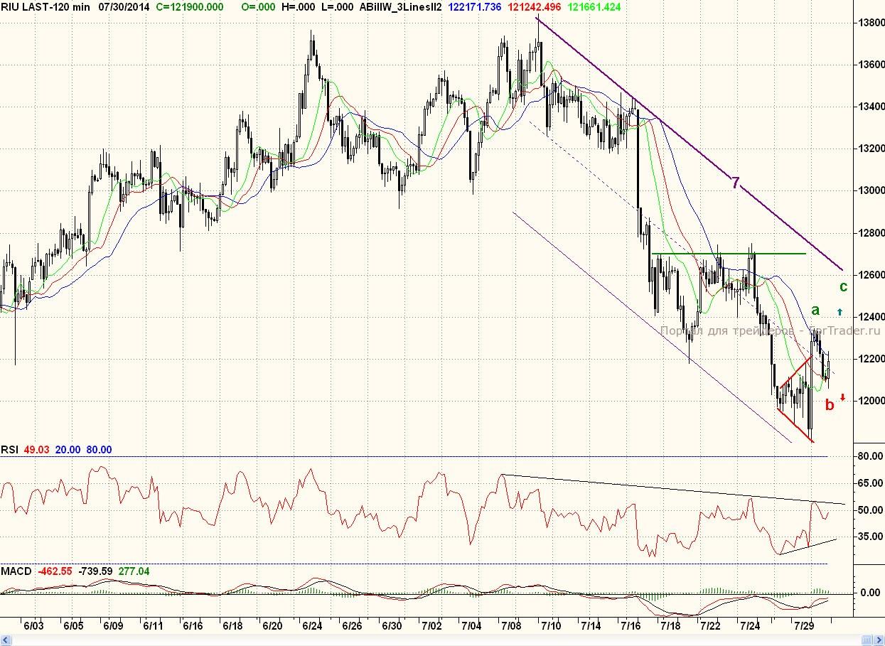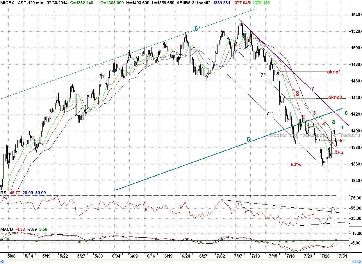 С технической точки зрения плюсом для покупателей является то, что бычьи дивергенции начали отрабатываться, и индекс ММВБ по 2- часам вышел из продажи. Объемы торгов на росте возросли. Позавчерашняя дневная свечная комбинация сработала, как и расширяющийся треугольник на фьючерсе на индекс РТС. А вечернее снижение вписывается в рамки формирования заходной растущей волны (a-b) коррекционной трехволновки (a-b-c). Так что покупатели могут рассчитывать на продолжение банкета. Но чтобы этот бычий сценарий начал реализовываться, ценам необходимо уверенно преодолевать вчерашний максимум a (1 403,55п.), а по RIU это 123 460 п. Но и про оборону покупателям необходимо помнить. В этом случае ближайшей поддержкой выступят вчерашние минимумы b (~1 382 п.) по индексу ММВБ и (120 610 п.) по RIU. Более сильной поддержкой выступит уровень 62% коррекции уже от вчерашнего роста (~1 375 п.) и (~120 100 п.)
