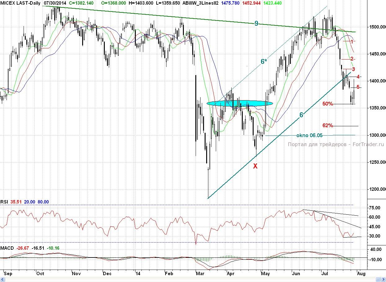 Исследуя 2-часовой график индекса ММВБ, видим, что открывшись с гэпом вниз, который был обусловлен секторальными санкциями со стороны США и ЕС дальнейшего снижения практически не последовало. Более того, начался безудержный рост, и уже через полчаса быки буквально смели ближайшее сопротивление – максимум вторника (~1 380 п.), а затем уверенно преодолели краткосрочный падающий тренд (8) и захлопнули окно понедельника №5 (~1 388 п.). Но на этом быки решили не останавливаться, и на спинах «медведей» к обеду дотащили котировки в район незакрытого окна пятницы №4 (1 403 — 1 408 п.п.). Только на этом уровне продавцы пришли в себя от такой прыти покупателей и начали контратаковать. А вынужденная 2 — часовая остановка торгов пошла им на руку. После возобновления работы основного сектора продажи продолжились. Тем не менее, набранной с утра высоты быкам хватило, чтобы день завершить в хорошем плюсе (0,9%), а индекс РТС за счет укрепления рубля вырос на 1,41%.