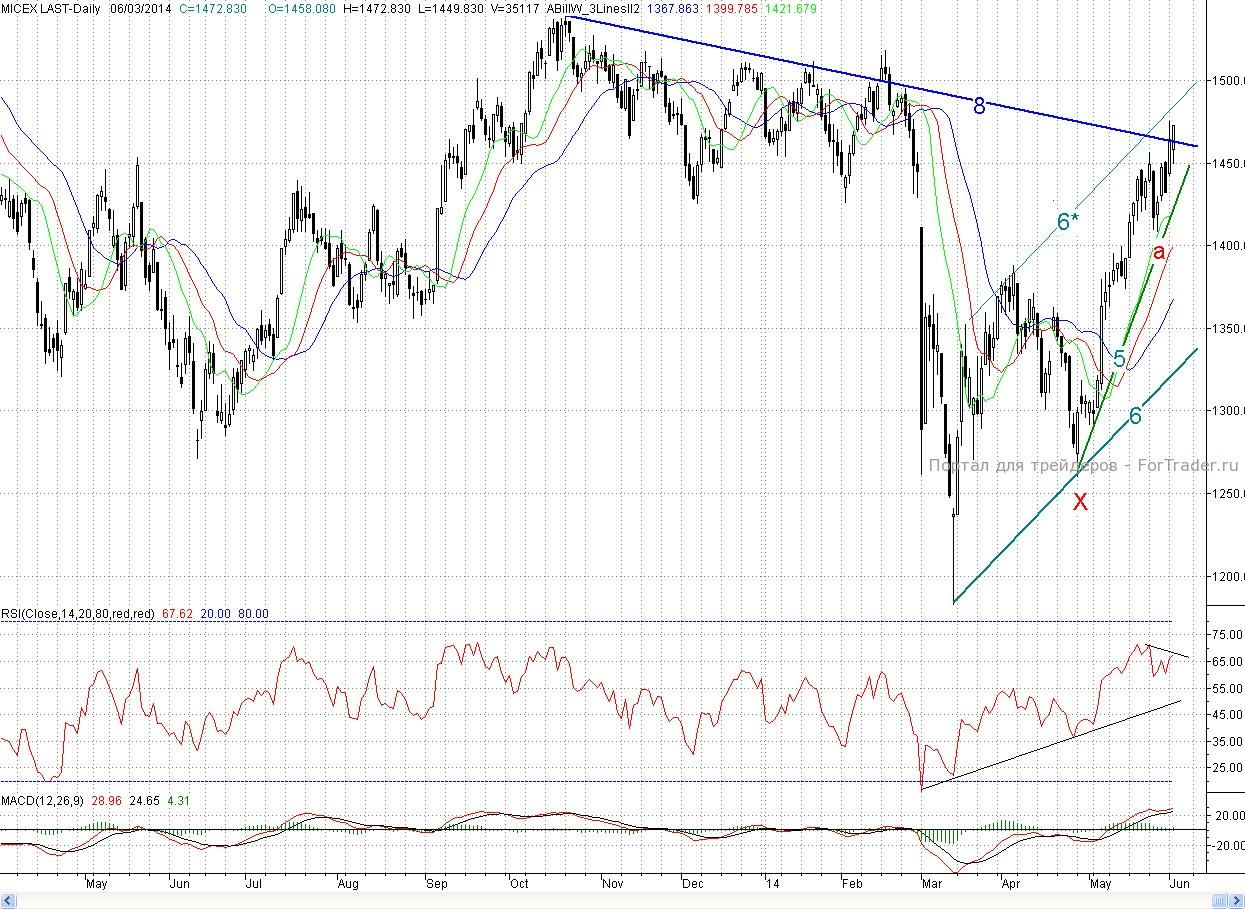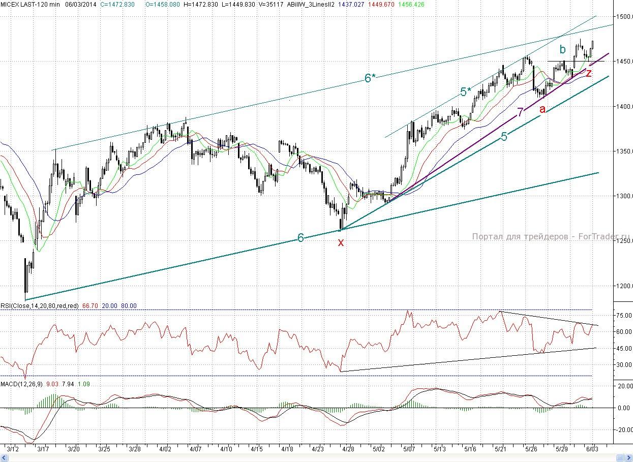 На сегодня ближайшим сопротивлением выступит максимум понедельника (1 475 п.), а далее уже упомянутая верхняя граница растущего канала (6-6*). Роль ближайшей поддержки сыграет вчерашний вечерний минимум (~1 463 п.), а далее новый растущий тренд (7) и вчерашний минимум Z (1 449,83 п.), который стал новым 2- часовым фракталом на продажу. Ключевым редутом быков остается дневной фрактал на продажу а (1 408,87 п.),