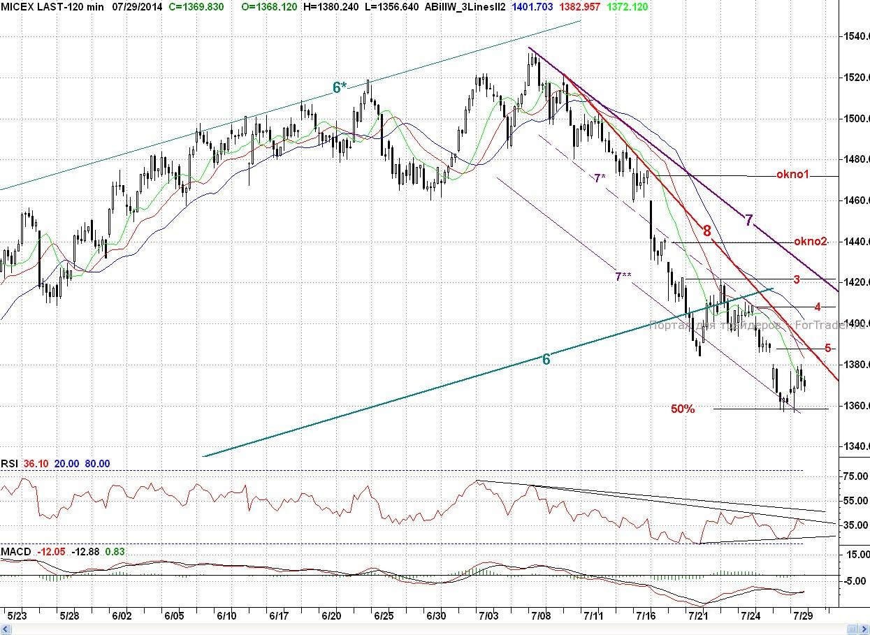 На сегодня роль ближайшей и основной поддержки сыграет все тот же уровень 50% коррекции и вчерашний минимум (1 356,41 п.) Ближайшим сопротивлением выступит утреннее окно, а далее вчерашний максимум (~1 380 п.), падающий тренд (8) и незакрытое окно понедельника №5 (~1 388 п.). Более сильным редутом будет незакрытое окно пятницы №4 (1 403- 1 408 п.п.)