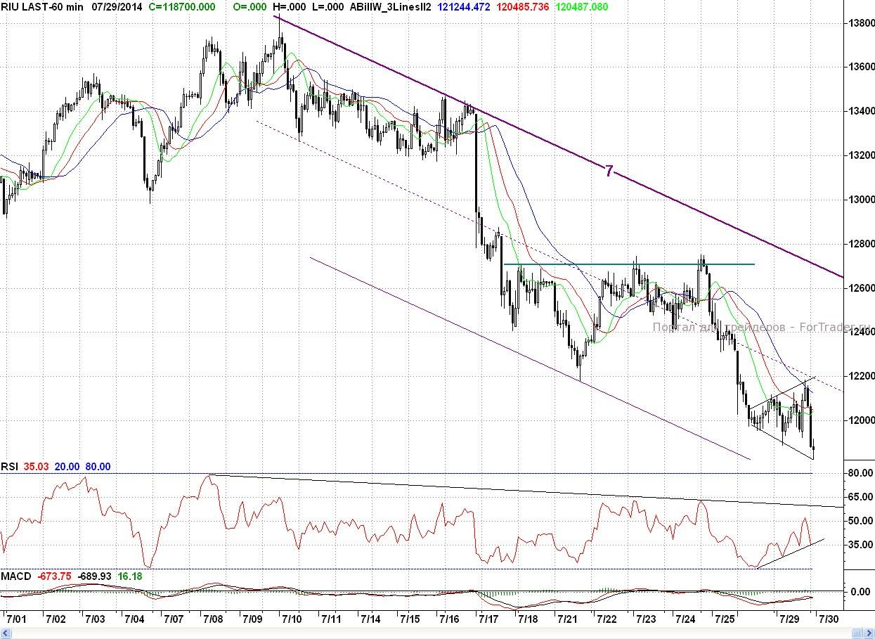 Таким образом, покупатели, вторично удержав основную поддержку, перешли в контрнаступление. Однако отскок пока получается не впечатляющим. Тем не менее, с технической точки зрения на 2- часах бычьи дивергенции ярко выражены, да и дневная комбинация из двух крайних свечей указывает на потенциальный разворот (но требуется подтверждение). А это дает основания покупателям развивать наступление. Однако секторальные санкции со стороны ЕС могут перечеркнуть этот зарождающийся подъем, что и показала вечерняя сессия ФОРТС. В самом начале ее цены уверенно пошли вверх, но стоило появиться сообщениям о санкциях, как рост, словно ветром сдуло, и медведи утащили котировки на новые минимумы. Однако на часовом графике фьючерса на индекс РТС нарисовался расширяющийся треугольник, а он, как правило, характеризует разворот. К тому же фактор санкций не был неожиданным, так как их объявление планировалось ранее. Тем не менее, «у страха глаза велики», что и вылилось в сильные распродажи. Но важно, как поведут себя покупатели на основной сессии. И если им удастся не поддаться панике, и утреннее снижение будет выкуплено, то перспективы дальнейшего роста будут неплохими.