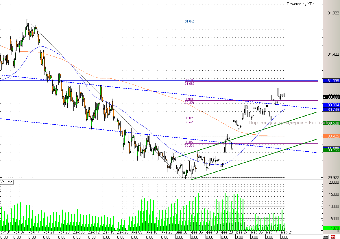 Относительная стабильность российского рубля в последние несколько дней наблюдается на фоне ожиданий существенных налоговых выплат от экспортеров уже в ближайший понедельник, а также некоторой консолидации нефтяных котировок у ранее достигнутых уровней. При этом неопределенность в отношении Кипра, которому к тому же сегодня S&P понизило рейтинг до преддефолтного, не дает рублю хоть немного подрасти. Ключевыми поддержками для рубля по-прежнему являются уровни 31 и 31,1, сопротивление располагается на отметке 30,8.