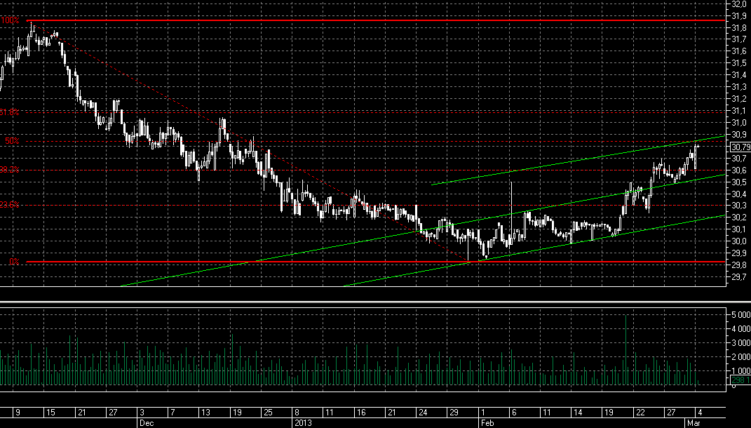 Пара доллар/рубль сегодня добралась до серьезного сопротивления на отметке 30,8, где находится 50% коррекции по Фибоначчи к волне снижения. В текущий момент уход сильно выше данной отметки выглядит как совсем непростая задача и для решения ее могут потребоваться дополнительные драйверы. Между тем давление на российскую валюту на текущей торговой сессии оказывает незначительные потери нефтяных котировок и снижение риск аппетита на мировых финансовых рынках. В свою очередь поддержка для рубля исходит лишь от высоких ставок по межбанковскому кредитованию.