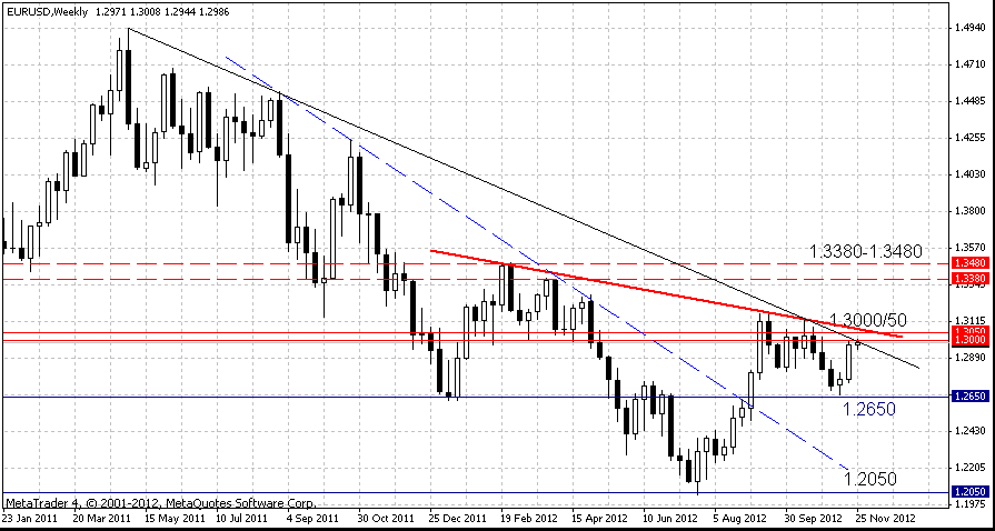 Рост курса EUR/USD выше 1.2875 (максимумы 7.11.12) заставил нас отказаться от «медвежьего» сценария развития событий по евро, как и от «коротких» позиций по данной паре, которые мы в итоге были вынуждены закрыть с результатом близким к нулевым. Сейчас у нас нейтральный взгляд по EUR/USD (отсутствие позиций), плюс мы видим ряд предпосылок для возможной игры на повышение по евро (сами пока не играем), которые (если реализуются) могут иметь далеко идущие последствия для европейской валюты.