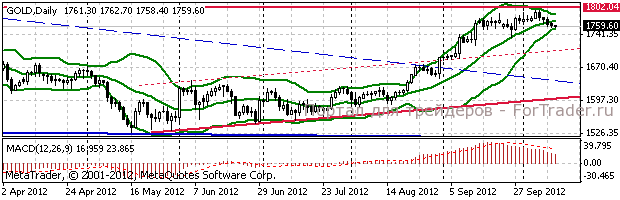 В случае восстановления выше $1770/80 (средняя линия дневного Боллинджера, максимум 9 октября) сопротивление будет встречено на $1786/96 (верхняя граница дневного Боллинджера, максимум 5 октября). Сильное сопротивление остается на $18002 (максимум сентября2011 г), преодоление которого откроет быкам дорогу на $1826.