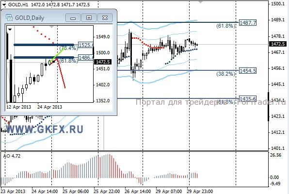 Цены на золото сформировали вчера внутренний бар на дневном графике, который обычно предвестник импульса. В какую сторону это вопрос, но учитывая, что рост в золоте, не такой частый в последнее время, то можно ожидать импульс вниз. Можно попробовать заработать на ожидаемом снижении. Цель снижения район 1435,0. Традиционно делаю два варианта движения цены на неделю, основной красный и альтернативный зеленый. Значимые уровни на сегодня отмечены на часовом графике. Индикатор АО находится в положительной зоне и снижается, указывая на коррекцию перед возможным дальнейшим ростом. Индикатор тренда указывает на рост. Зайдем против индикаторов. Sell от 1475,0 или выше со стопом 1482,00. Цель1 1455,0. Цель2 1435,0. Не забываем ставить безубыток при первой же возможности.