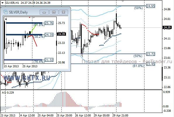 Цены на серебро также сформировали внутренний бар на дневном графике, что может говорить о скором импульсе. Традиционно делаю два варианта движения цены на неделю, основной красный и альтернативный зеленый. Значимые уровни на сегодня отмечены на часовом графике. Индикатор АО находится в положительной зоне и снижается, указывая на коррекцию перед возможным дальнейшим ростом. Индикатор тренда указывает на рост. Зайдем против индикаторов. Sell от 24,45 или выше со стопом 24,55. Цель 24,10. Не забываем ставить безубыток при первой же возможности.