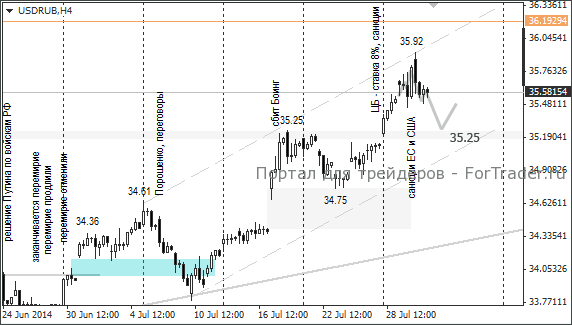 За вчерашний день доллар потерял 20 копеек, евро – 35 копеек. Вполне вероятно, что сегодня падение валют продолжится до уровней 35,35 и 47,35, что позволит рублю дополнительно отыграть понесённые потери с 23 июля. По доллару ближайшая цель 35,25 – уровень, с которого началось резкое удешевление рубля.