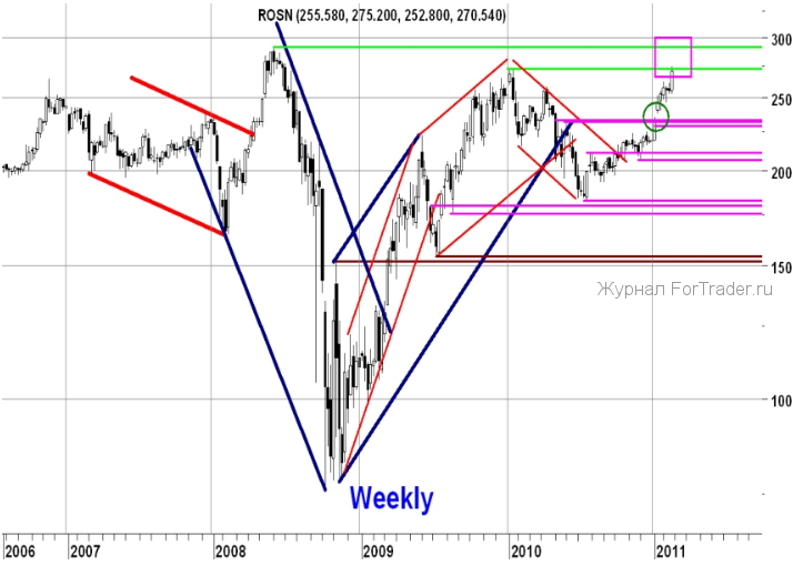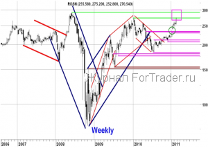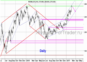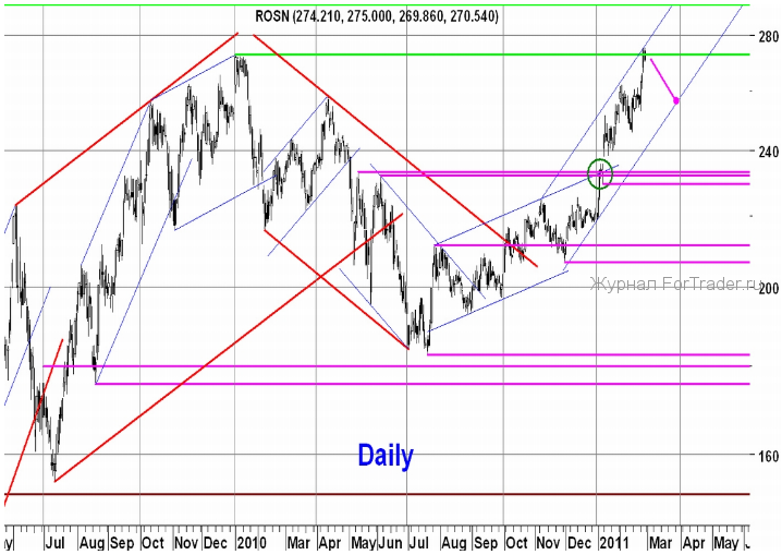 После того, как в начале января гэпом вверх был пробит важный горизонтальный уровень сопротивления 232-233.4 р., акции Роснефти продолжили восходящее движение. В начале февраля произошла хорошая нисходящая коррекция от уровня 262 р. до отметки 245.8 р., после чего рост возобновился. Вчера был обновлён максимум 2010 г. 272.7 р. и после достижения отметки 275 р. произошел небольшой откат вниз. О пробое уровня 272.7 р. можно будет говорить с уверенностью, если дневная свечка будет закрыта выше отметки 275 р., пока же всё это выглядит как откат от уровня сопротивления. Если этот пробой всё-таки произойдёт, следующим серьезным сопротивлением может стать исторический максимум 291.36 р.