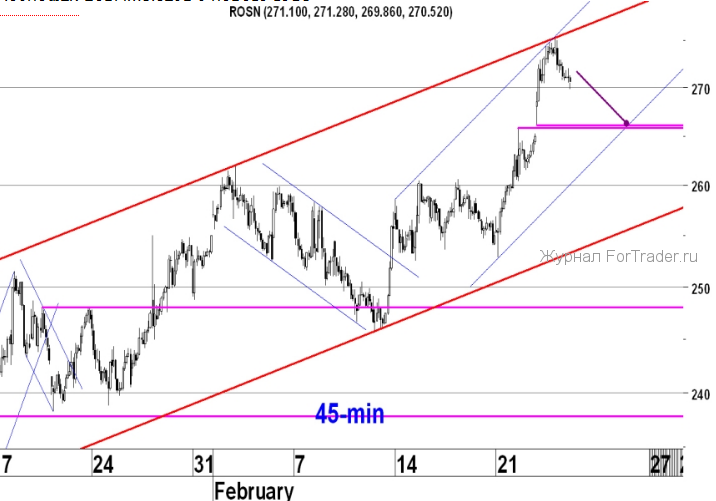 На 45-ти минутном графике Роснефть продолжает двигаться в краткосрочном восходящем канале, и вчера образовался незакрытый гэп вверх 265.85-266.16 р., который теперь является хорошим уровнем поддержки. Пока акция находится в рамках этого канала, скорей всего мы увидим очередную попытку пробить уровень 275 р. Если же горизонтальный уровень 265.85 р. будет пробит вниз, скорей всего мы увидим продолжение нисходящей коррекции до нижней границы среднесрочного восходящего канала на 45-ти минутном графике. Пробой этой границы, вероятнее всего, спровоцирует ещё более глубокую коррекцию до нижней границы краткосрочного восходящего канала на дневном графике, в котором акции Роснефти повышаются с нового года.