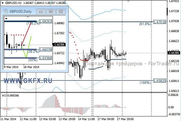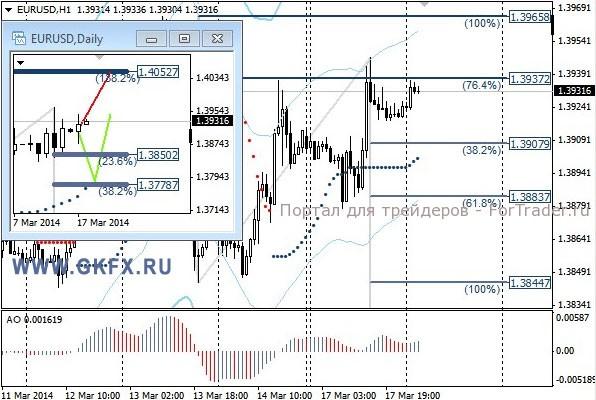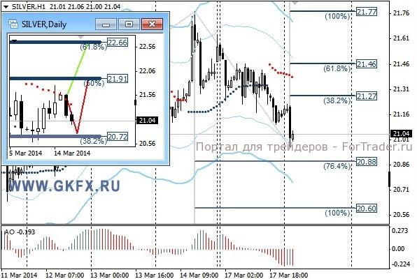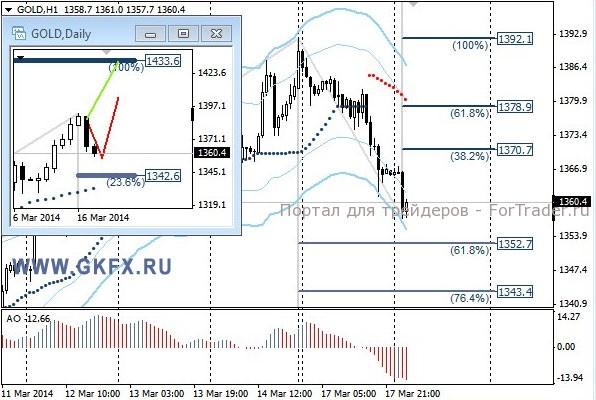 Цены на золото отступили и пошли на коррекцию в соответствии с красным сценарием движения цены. Напряженность вокруг Украины немного спала после проведенного референдума в выходные в Крыму, который показал, что подавляющее большинство Крымчан желают присоединиться к России. Выходившая вчера статистика по США оказалась слабоватой, однако золото продолжило снижаться в цене. Скорее всего, завтра надо будет ловить цену на возобновлении роста. Традиционно делаю два варианта движения цены на неделю, основной красный и альтернативный зеленый. Значимые уровни на сегодня отмечены на часовом графике. Индикатор АО находится в отрицательной зоне и снижается, указывая на желание инструмента двигаться вниз. Индикатор тренда указывает на снижение. Вне рынка.