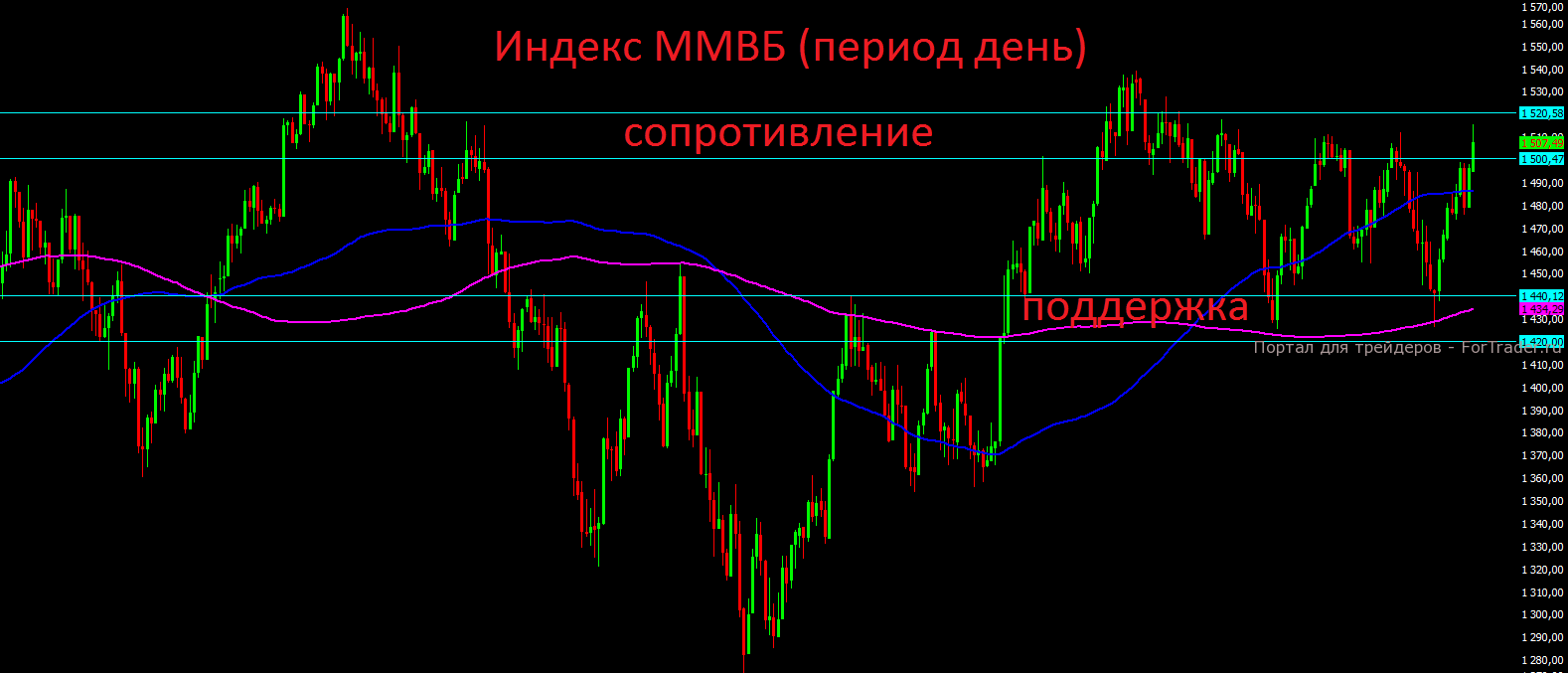 Российский индекс ММВБ достиг самого важного сопротивления в диапазоне 1500-1520, где уже в понедельник вновь мы начали наблюдать аккуратные продажи и фиксацию прибыли. Ещё 1-2 дня индекс ММВБ может и сможет удерживать эти рубежи, но после этого последует новая коррекция. Несмотря на весь мировой оптимизм, покупать российские акции на текущих уровнях явно не стоит, пройдёт 1-2 месяца и цены будут намного привлекательней.