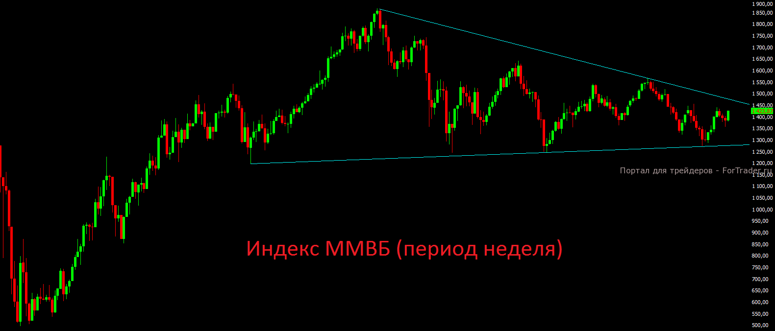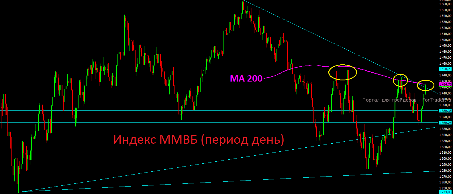 После трёх недельного снижения всего четыре торговых дня понадобилось российским индексам, чтобы компенсировать все потери. Вновь российский индекс ММВБ устремился к своему самому сильному и важному сопротивлению на отметке 1450 пунктов, до которого осталось менее 2%, но вот порох в пороховницах явно уже кончается. На текущий момент цена вновь столкнулась с сопротивлением вблизи 200-дневной скользящей средней, от которой в прошлые месяцы мы уже наблюдали коррекцию. Сегодня, похоже, нас ждёт новый отбой от этой скользящей, однако поводов для серьёзного снижения пока нет. Пока мы не увидим разворотную формацию на дневном графике, говорить о начале коррекции не стоит, хотя и стоит к ней готовиться.