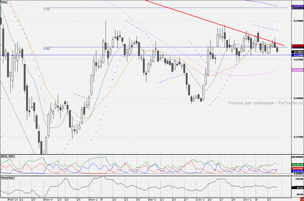 Акции «ФСК ЕЭС» с начала октября консолидируются под линией нисходящего тренда, действующего с января прошлого года. Сегодня данный уровень сопротивления находится на отметке 23,50 коп., кроме того, чуть ниже проходят 10- и 21- дневные скользящие средние. Пока технические индикаторы посылают преимущественно негативные сигналы. Индикатор ADMI/ADX показывает, что силы «медведей» по бумагам преобладают (линия «быков» находится ниже линии «медведей»). График осциллятора Momentum направлен вниз, что может свидетельствовать о продолжении нисходящей динамики акций. Ближайшей поддержкой является уровень 22,80 коп. Стоит отметить, что бумаги уже не раз удерживали данную отметку, в связи с чем от поддержки 22,80 коп. спекулятивные «короткие» позиции стоит сокращать. Наш 30-минутный торговый робот пока находится в «шортах», удерживая короткие позиции от отметки 23,50 коп.