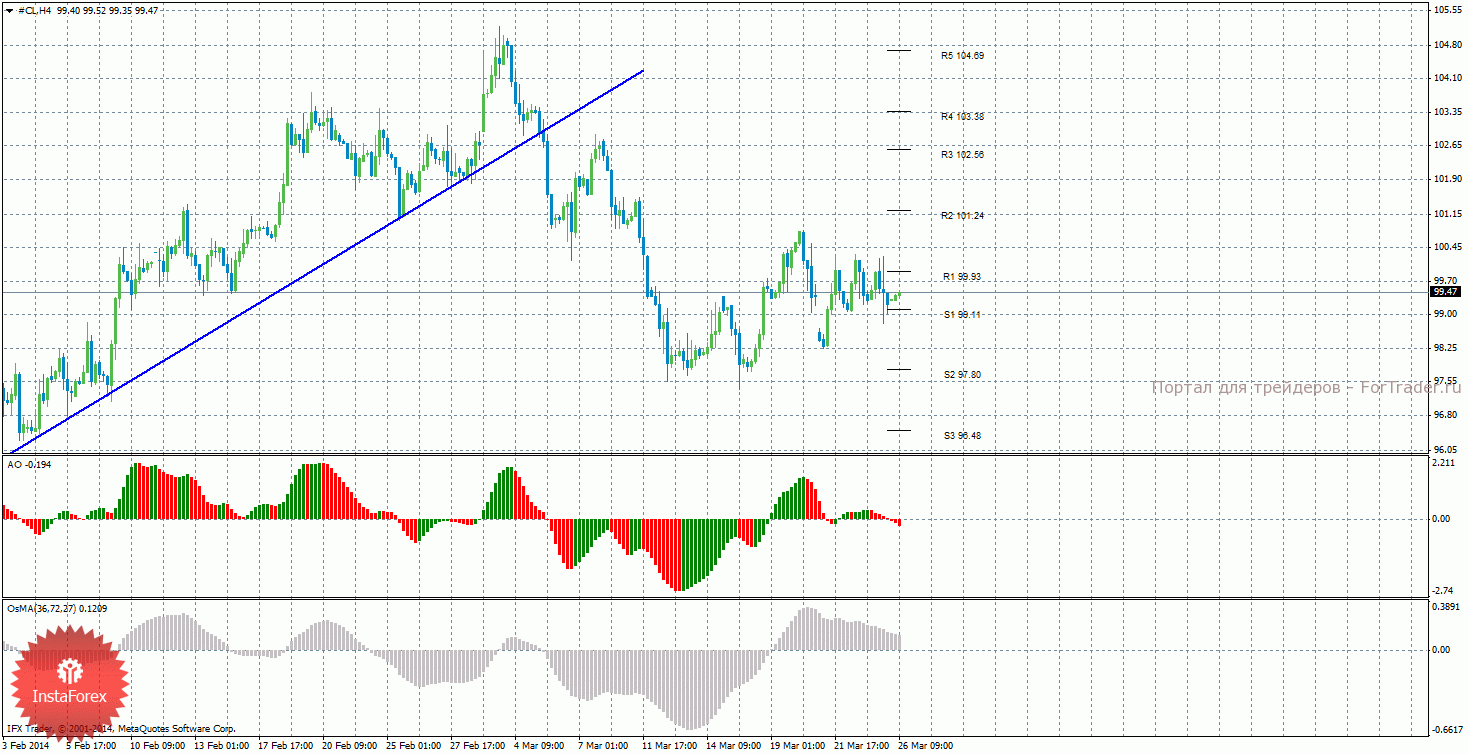 Анализ сырой нефти за 26 марта показывает, что цена продолжает располагаться между уровнями S1 и R1 и никак не может определиться с направлением движения. Нисходящее движение может продолжиться с целями S2 – 97,80 и S3 – 96,48, если цена закрепится ниже уровня 99,11. Может возобновиться восходящая коррекция с целями 99,93 и 101,24 в случае, если цена останется выше уровня 99,11. Восходящая линия тренда больше не оказывает поддержку торгующим на повышение, цена располагается ниже нее, поэтому сейчас являются актуальными короткие позиции. Нисходящей линии тренда на данный момент нет. Индикатор Awesome показывает текущее нисходящее движение, так как последний закрытый бар красного цвета. OsMA также направлен вниз, что говорит о нисходящем характере движения и в более долгосрочном плане. Если цена отскочит от уровня 99,11, это может засвидетельствовать новый виток восходящей коррекции.