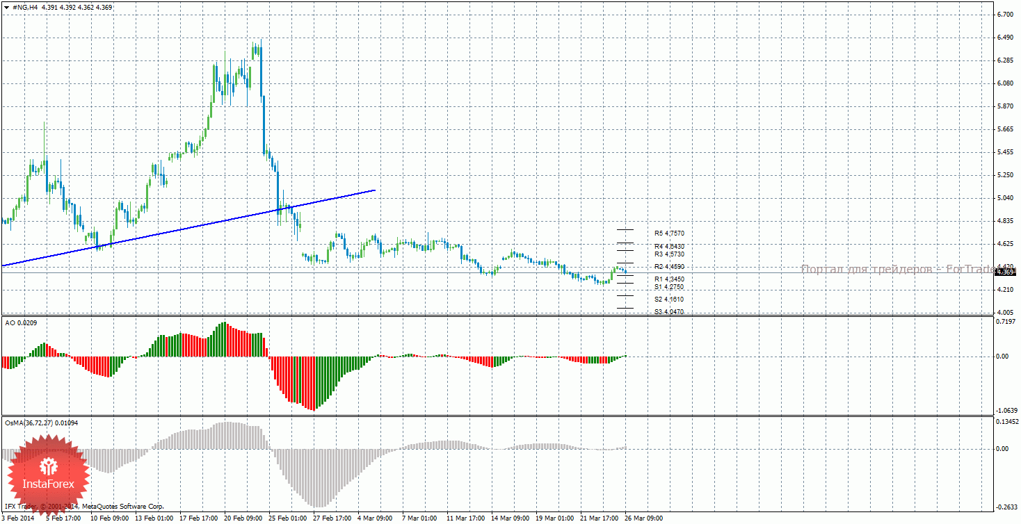 Анализ природного газа за 26 марта показывает, что цена начала виток коррекционного движения и располагается чуть выше уровня R1 – 4,3450. На данный момент актуально нисходящее движение с целями уровни поддержки S1 – 4,2750 и S2 – 4,1610, если цена закрепится ниже уровня 4,3450. Целями для возможной восходящей коррекции выступают уровни сопротивления 4,4590 и 4,5730, если цена останется выше уровня 4,3450. Цена закрепилась ниже восходящей линии тренда, поэтому она более не актуальна, тенденция на рынке поменялась на нисходящую. Нисходящая линия тренда отсутствует. Индикатор Awesome показывает локальное восходящее движение, последний закрытый бар окрашен в зеленый цвет. OsMA также направлен вверх, что сигнализирует о восходящем движении цены на газ и в более долгосрочной перспективе. Сейчас по-прежнему не самая благоприятная ситуация для открытия позиций.